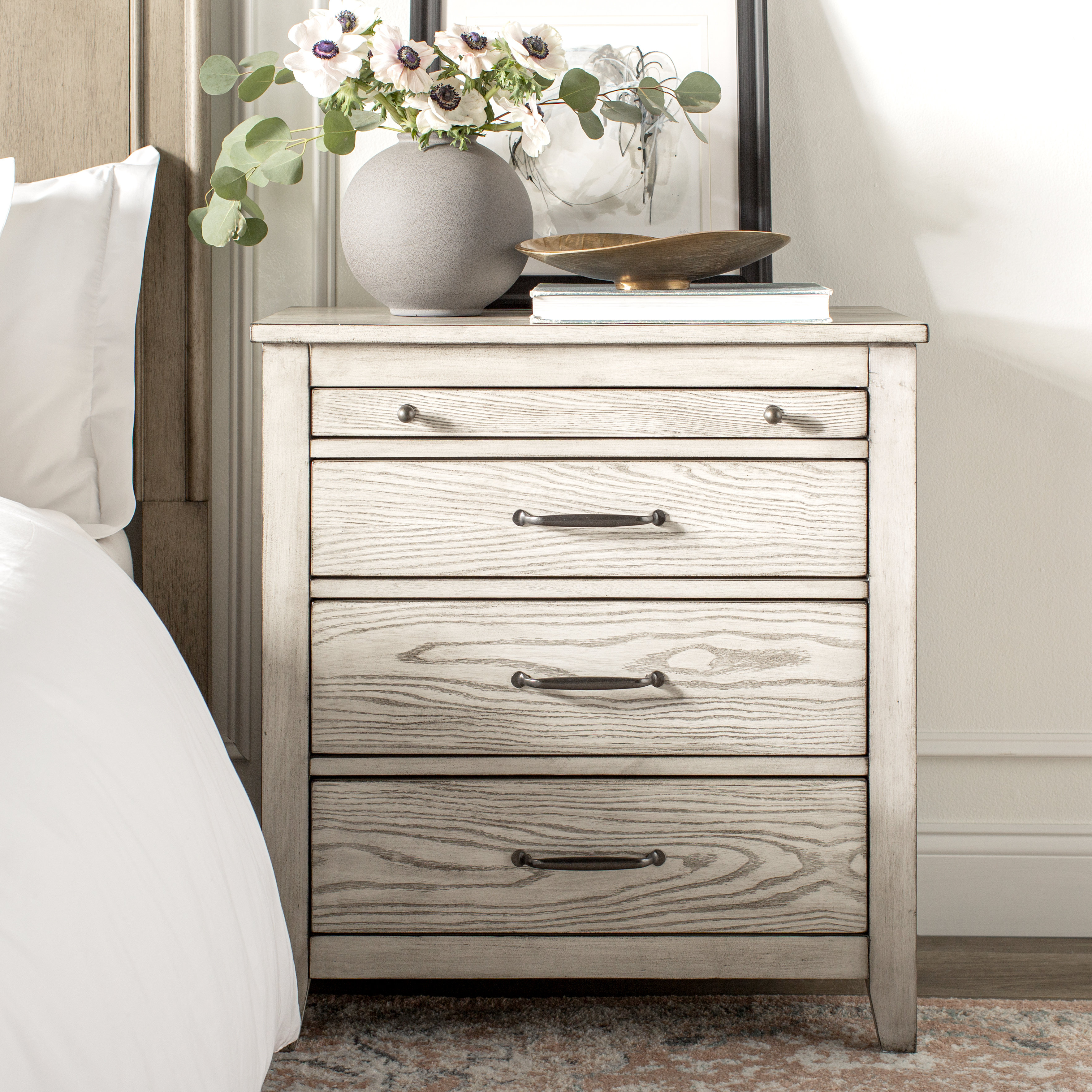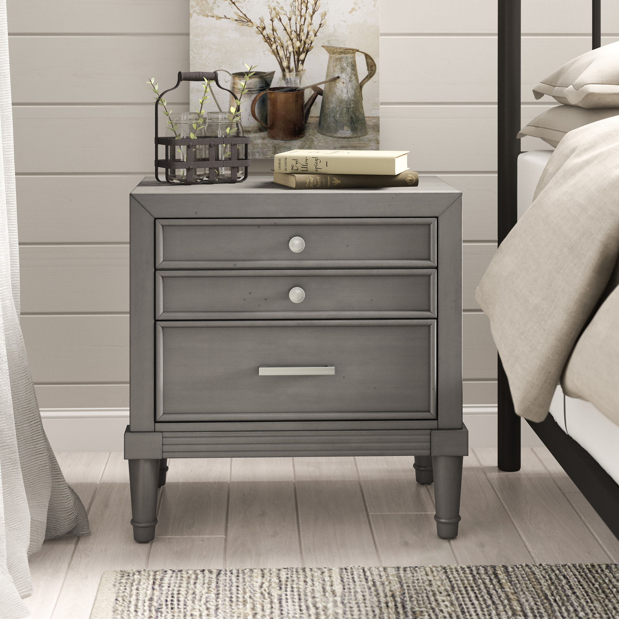 Rosaleen white storage side table an antique found at a belgian flea market an antique found at a belgian flea market inspired the delicate details of this chic white side chest. 3 drawers offer plenty of storage for living room accessories, remote controls, games, and more. The brittany 3 drawer side table in gray tweed from bungalow 5 offers a handsome contemporary style with a sophisticated shape and texture. Side table storage chest measures 16 in. Complete your bedroom with nightstands and bedside tables that offer a convenient perch for a lamp, alarm clock and reading material. Jofran grey mosaic end table. Rated 4.5 out of 5 stars. Ships free orders over $39. Gray 3 drawer side table/ storage. Safavieh american homes collection griffin grey 3 drawer side table. Available in gray, white, and walnut finishes. Rated 5 out of 5 stars. Free delivery best price guarantee.